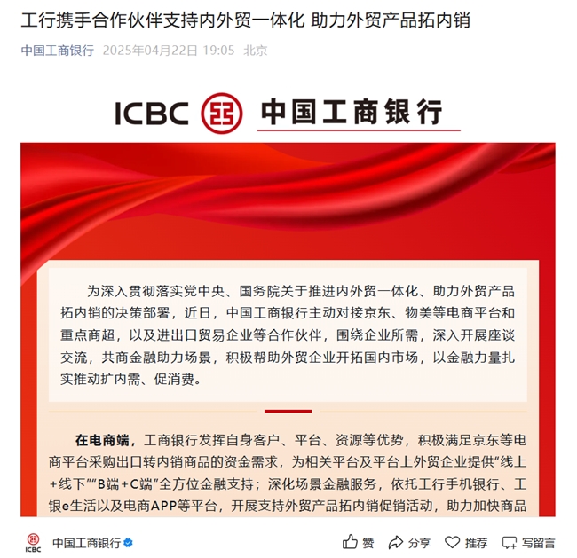 其中,工商银行第一时间与京东出口转内销扶持计划进行对接,建立专项对接机制,通过工行手机银行、工银e生活等平台,支持外贸产品拓内销促销活动,助力加快商品流通。同时为京东平台上外贸企业提供“线上+线下”“B端+C端”全方位金融服务,全力支持内外贸一体化。